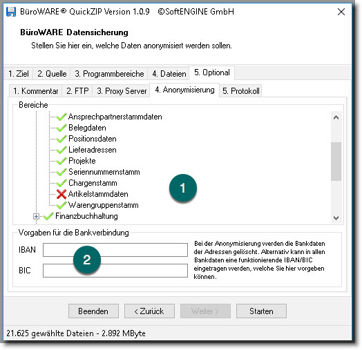 „BWQuickZIP“ ist nur mit der Standard BüroWARE-Version kompatibel. Das heißt, die Anonymisierung darf z.B. in einer PPS nicht auf Bereiche angewandt werden, bei denen die Satzbeschreibung vom Standard abweicht.