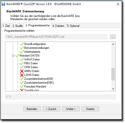 Die Standardsicherung enthält eine Filterung, welche in der Datei „BWQZFC.XML“ festgelegt ist. In dieser Datei können (entsprechende Designkenntnisse vorausgesetzt) auch weitereSicherungsprofile (analog „Standardsicherung“) angelegt werden.