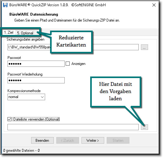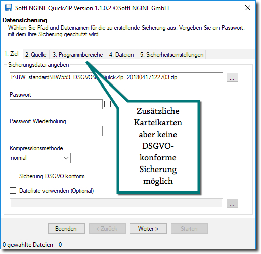 Im Falle einer deaktivierten DSGVO-Option können Sie beispielsweise eine Vorgabedatei anwenden, die spezielle Angaben zur Sicherung enthält. Auch hier sind dann die Registerkarten eingeschränkt.
