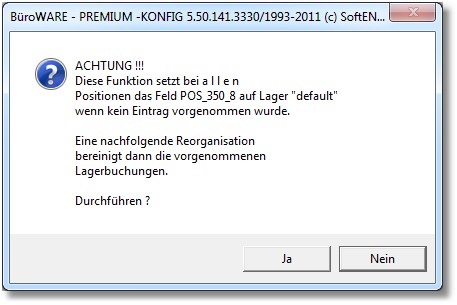 Mit dieser Funktion wird im Feld AN LAGER (POS_350_8) der Belegpositionen der Wert "default" geschrieben, wenn kein Eintrag vohanden ist (leer). Nach dem Lauf ist eine Komplett-Reorganisation erforderlich. Vor dem Lauf ist unbedingt eine Datensicherung anzufertigen.