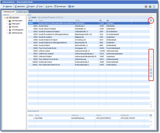Vor die Stammdaten des Programms sind Tabellen gelegt, die die Datensätze in einem Browse-Modus darstellen. Hauptziele dieser Tabellen sind die übersichtliche Darstellung und das schnelle Auffinden von gesuchten Datensätzen. Um das Auffinden zu erleichtern, verfügt die Tabelle über Sortier-, Such- und Filterfunktionen.