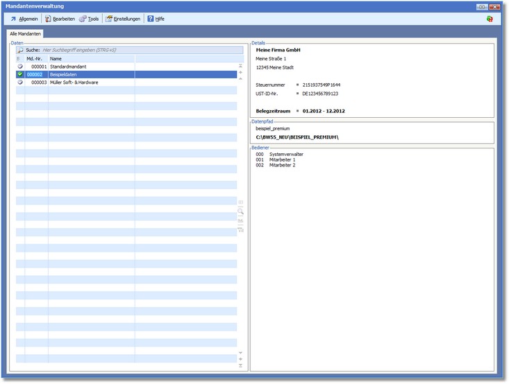 In der Mandantenverwaltung werden Mandanten angelegt, bearbeitet und gelöscht. Auch die Zuordnung der Bediener und der Mandantenwechsel erfolgt über die Mandantenverwaltung.