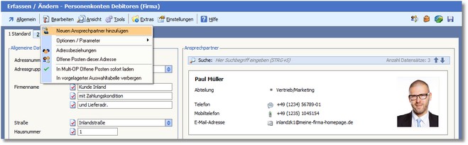 << Hier KLicken um eine Inhaltsübersicht anzuzeigen >> Navigation: Finanzbuchhaltung > Stammdaten > Personenkonten > Die Karteikarte "Adressauswahl" > Adressen erfassen/ändern > Ansprechpartner |