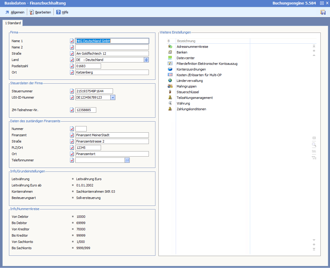 Neben den grundlegenden Firmeninformationen auf der linken Seite gibt es rechts das zentrale Dialogfeld "Weitere Einstellungen". Hier können Sie mit einem Doppelklick auf einen Eintrag den entsprechenden Bearbeitungsdialog starten.
