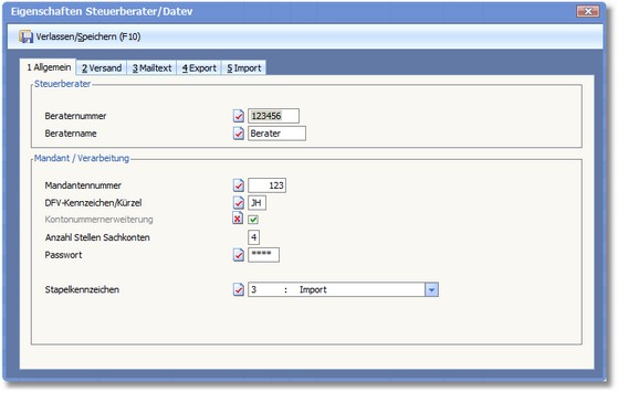 Das Programm öffnet den Dialog "Eigenschaften Steuerberater/Datev".