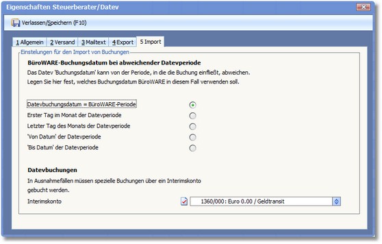 Hier ist das Buchungsdatum bei abweichender Datev-Buchungsperiode und das INTERIMSKONTO festzulegen.