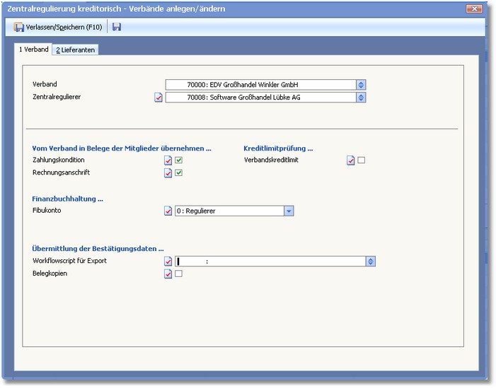 << Hier KLicken um eine Inhaltsübersicht anzuzeigen >> Navigation: Finanzbuchhaltung > Stammdaten > Personenkonten > Die Karteikarte "Adressauswahl" > Adressen erfassen/ändern > Personenkonten bearbeiten - Menü > Zentralregulierung > Adresse als Verband aufnehmen (Kreditor) > Zentralregulierung kreditorisch - Verbände anlegen/ändern |