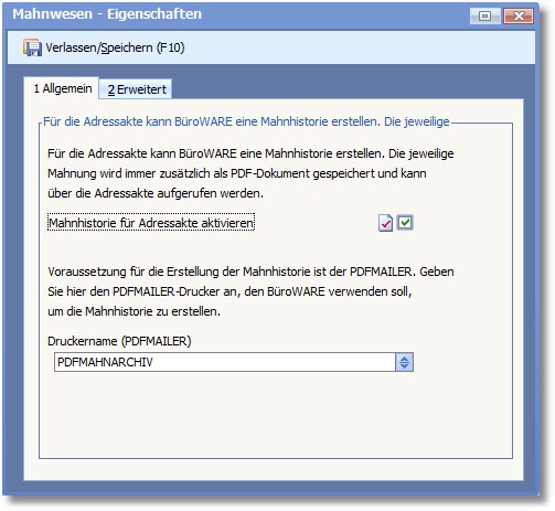 In der Karteikarte "Erweitert" können Sie das erweiterte Mahnwesen sowie die Verwendung von belegbezogenen Mahngruppen aktivieren.