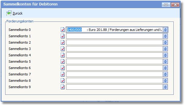 << Hier KLicken um eine Inhaltsübersicht anzuzeigen >> Navigation: Finanzbuchhaltung > Stammdaten > Basisdaten > Basisdaten - Menü "Bearbeiten" > Sammelkonten für Debitoren |