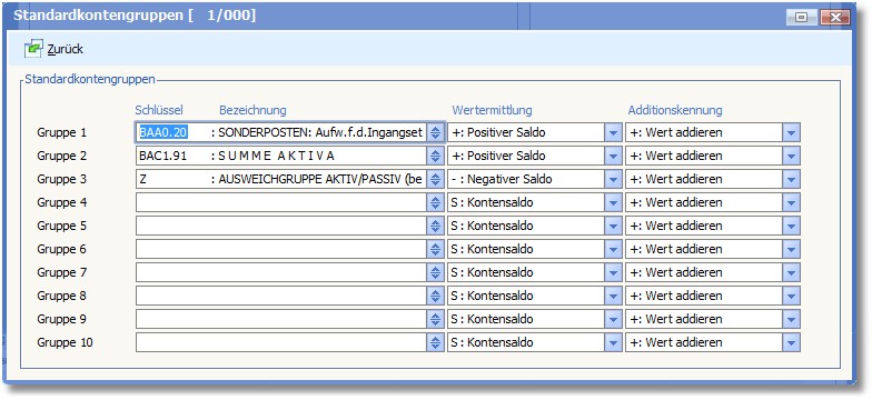 Über die Wertermittlung wird festgelegt, ob der Kontensaldo in Unabhängigkeit von dessen Zuordnung (Soll- oder Habensaldo) oder jeweils nur ein positiver (Soll) oder nur ein negativer (Haben) Saldo in den Bereich einfließen soll. Das Summierungskennzeichen (+ oder -)gibt an, ob der Wert dem Bereich hinzu addiert oder abgezogen wird.