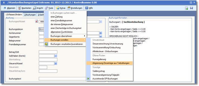 | 1. | Wählen Sie in der Buchungsmaske den Menüpunkt "Tools > Buchungen erstellen > Abgrenzung Zinserträge aus Teilzahlungen". |