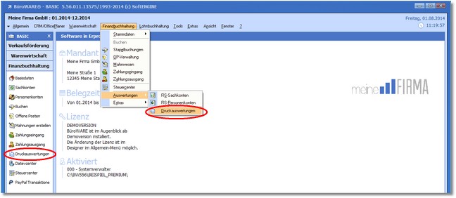 1. Klicken Sie mit der Maus im Hauptmenü auf „Finanzbuchhaltung > Auswertungen > Druckauswertungen"