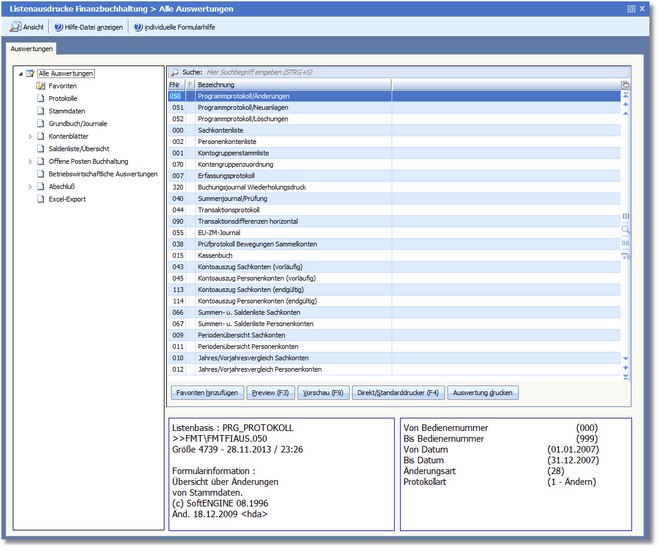 Das Programm öffnet den Dialog "Listenausdrucke Finanzbuchhaltung".