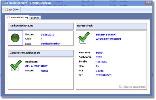 Die gewünschte Zahlungsart "Rechnung" wurde von creditPass® autorisiert, ist also hier genehmigt.