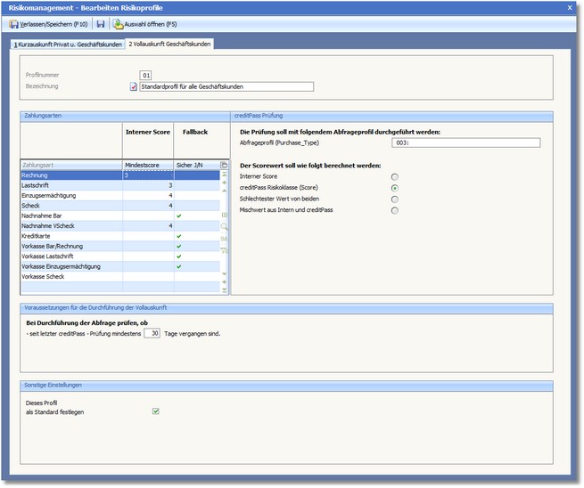 << Hier KLicken um eine Inhaltsübersicht anzuzeigen >> Navigation: Finanzbuchhaltung > OP-Verwaltung > Debitorenkennzahlen/Rating > Debitorenrating einrichten > Die Karteikarte "Risikoprofile" > Risikoprofile bearbeiten > Vollauskunft (Geschäftskunden) |
