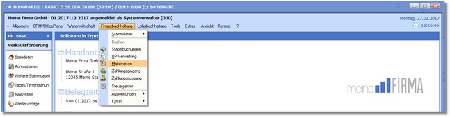 | 1. | Klicken Sie mit der Maus im Hauptmenü auf "Finanzbuchhaltung > Mahnwesen". |