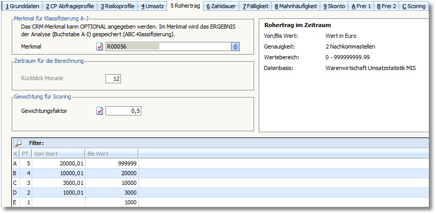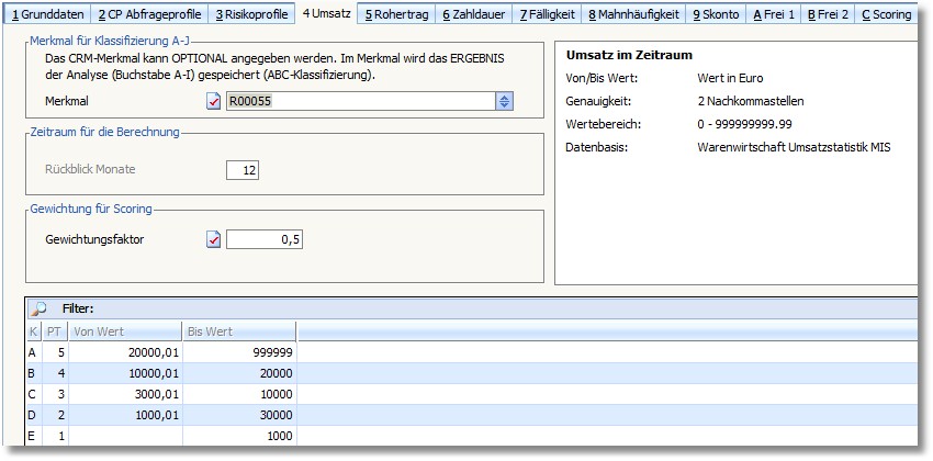 Sämtliche ABC-Analysen können für die Ermittlung des Scorewertes herangezogen werden - und zwar unterschiedlich gewichtet. Für die Bonitätseinstufung ist ggf. der Umsatz weniger von Bedeutung wie die