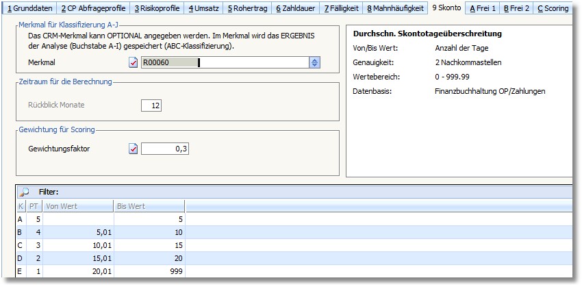 << Hier KLicken um eine Inhaltsübersicht anzuzeigen >> Navigation: Finanzbuchhaltung > OP-Verwaltung > Debitorenkennzahlen/Rating > Debitorenrating einrichten > Die Karteikarten "Umsatz" bis "Skonto" > Ratingbeispiele |