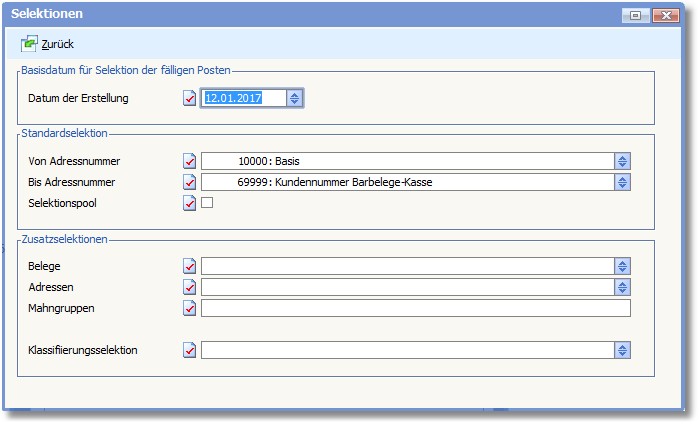 Hier können zusätzliche Selektionen hinterlegt werden. Diese werden dann bei der Mahnerstellung berücksichtigt.