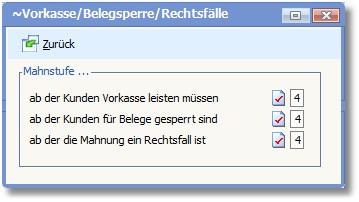 << Hier KLicken um eine Inhaltsübersicht anzuzeigen >> Navigation: Finanzbuchhaltung > Stammdaten > Basisdaten > Mahngruppen > Mahngruppe erfassen/ändern > Die Karteikarte "Standard" > Vorkasse/Belegsperre/Rechtsfälle |