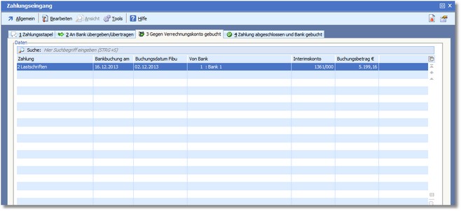 << Hier KLicken um eine Inhaltsübersicht anzuzeigen >> Navigation: Finanzbuchhaltung > Zahlungsverkehr > Zahlungseingang > Die Karteikarte "Gegen Verrechnungskonto gebucht" |