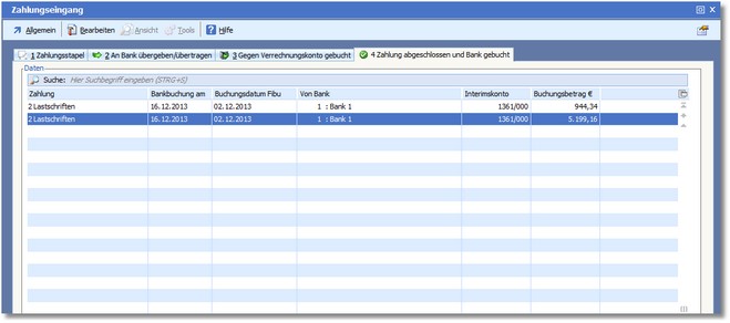 In dieser Karteikarte werden alle Zahlungsstapel angezeigt, die erfolgreich an die Bank übertragen und in der Finanzbuchhaltung verbucht wurden.