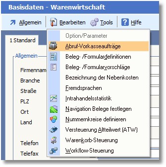 1. In die Einstellungen für Vorkasseaufträge gelangen Sie über den Menüpunkt „Bearbeiten > Abruf-/Vorkasseaufträge“ in das Auswahlfenster „Abruf- Vorkasseaufträge“.