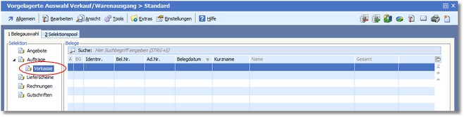 Nach Verlassen des Beleges wird der Vorkasseauftrag in der Auswahltabelle dargestellt.