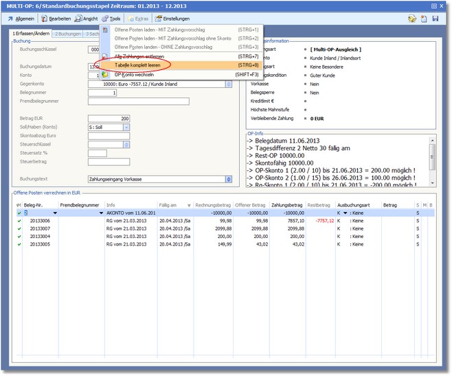 7. In der Buchungserfassung geben Sie nun den Zahlungseingang über den Multi-OP-Ausgleich ein. Aufgrund der Einstellungen im Firmenstamm werden alle OP´s in der Tabelle geladen.
