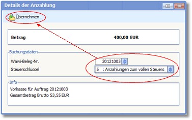 9. Nach Bestätigen des Zahlungsbetrags mit [RETURN] wird der Dialog "Details der Anzahlung" geöffnet, wo Sie im Feld WAWI-BELEG-NR mit [F5] den gewünschten Vorkassebeleg in der Auswahltabelle suchen und anschließend mit [RETURN] übernehmen können.