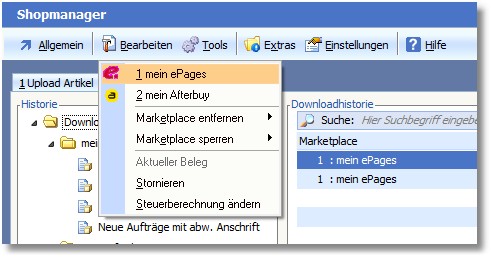 Wenn bereits mehrere Marketplaces angelegt wurden, werden diese unter dem Menüeintrag "Bearbeiten > Stammdaten" einzeln aufgelistet und können durch Klick auf den gewünschten Marketplacename ausgewählt werden.