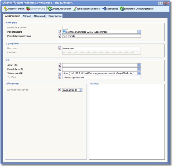 In der Marketplaceverwaltung können Sie Zugangsdaten, Einstellungen zu Upload und Download einsehen und bei Bedarf ändern.