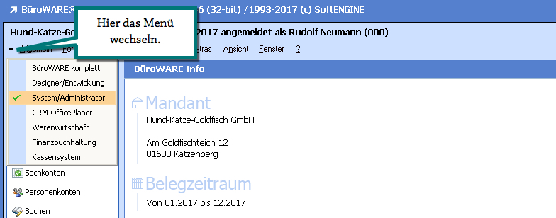 Nach dem Menüwechsel können Sie den Menüpunkt "Mandantenverwaltung" im Menü "Allgemein" öffnen.