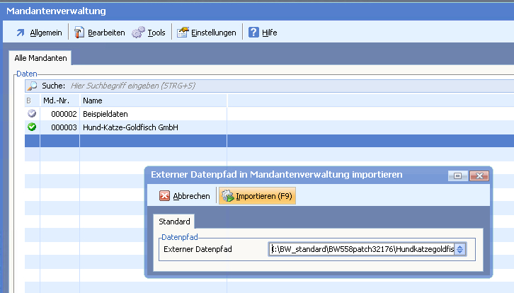 Hier finden Sie im Menü "Tools" den Eintrag "Externen Datenpfad in Mandantenverwaltung importieren".