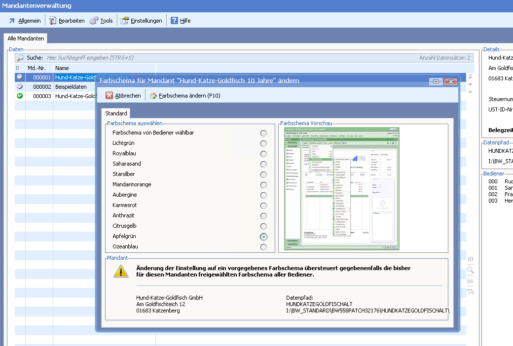 Sie können pro Mandant eine eigene Farbe wählen und somit verhindern, dass im unbewusst falschen Mandanten gearbeitet wird.