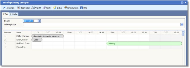 Unter dem Punkt "Gruppenplanung", den man in der Terminverwaltung über den Menüeintrag "Allgemein > Gruppenplanung" aufrufen kann, können Sie sich die Mitglieder einer auszuwählenden Arbeitsgruppe und deren Termine pro Tag bzw. Woche anzeigen lassen.