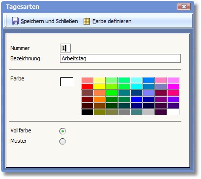 Die definierten Tage (Arbeitstage, Feiertag etc.) werden mittels einer farblichen Kennung unterschieden. Dabei stehen zur Definition folgende Felder zur Verfügung:
