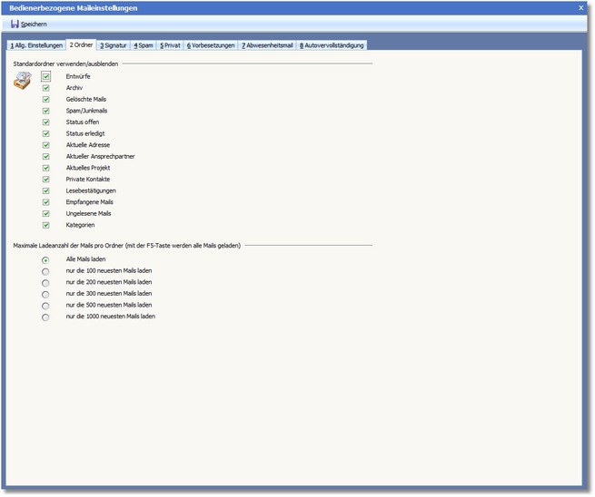 Des Weiteren können Sie hier bestimmen, wie viele Mails pro Ordner angezeigt werden sollen, um bei hohem Mailaufkommen die Ladezeiten zu verkürzen.