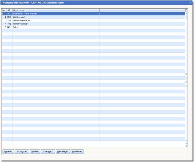 Das Programm öffnet die vorgelagerte Auswahl CRM-WVL-Kategorienstamm.