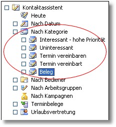 Wiedervorlagen-Kategorien werden in der Baumauswahl des Kontaktassistenten angezeigt.