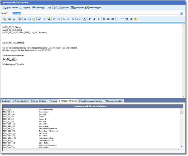 •Einer Auswahl von Adressen bzw. Ansprechpartnern, an welche die E-Mail versendet werden soll und die mit ihren Daten die Variablen des E-Mail-Textes füllen.