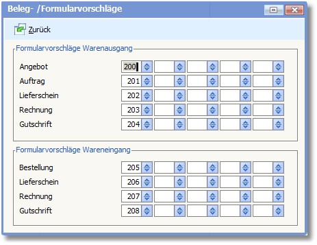 In diesem Dialog werden die Formularvorschläge eingetragen. Dabei können für jede Belegart fünf Formulare angegeben werden, die am Ende der Belegerfassung nacheinander für den betreffenden Beleg ausgedruckt werden. Diese Vorschläge sind vor dem Ausdruck der Belege über den Druckdialog nochmals änderbar.