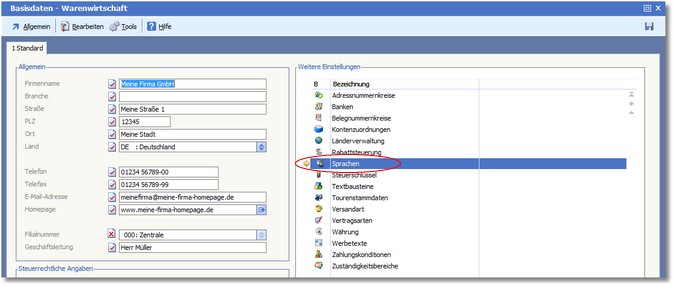 Die Sprachverwaltung ermöglicht die Definition von bis zu 99 Fremdsprachen. Außerdem besteht die Möglichkeit, die Belegübernahmetexte in der jeweiligen Fremdsprache zu erfassen.