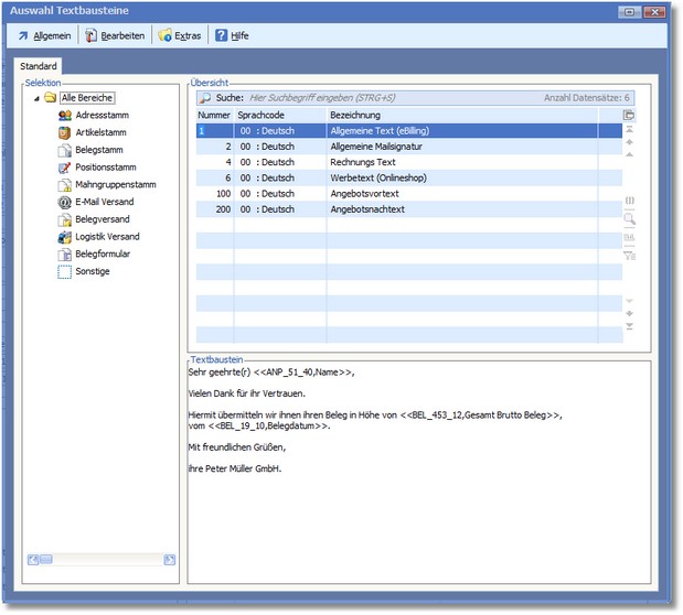 Textbausteine können in Notizfeldern verwendet werden und stehen z.B. innerhalb der Positionserfassung der Belege als Kommentarzeile zur Verfügung. Sie können auch für weitere Bereiche, bspw. in Belegformularen, für E-Billing oder E-Mails verwendet werden.