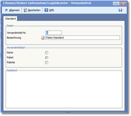 << Hier KLicken um eine Inhaltsübersicht anzuzeigen >> Navigation: Warenwirtschaft > Stammdaten > Basisdaten > Versandart > Versandmittel > Die Karteikarte "Standard" |