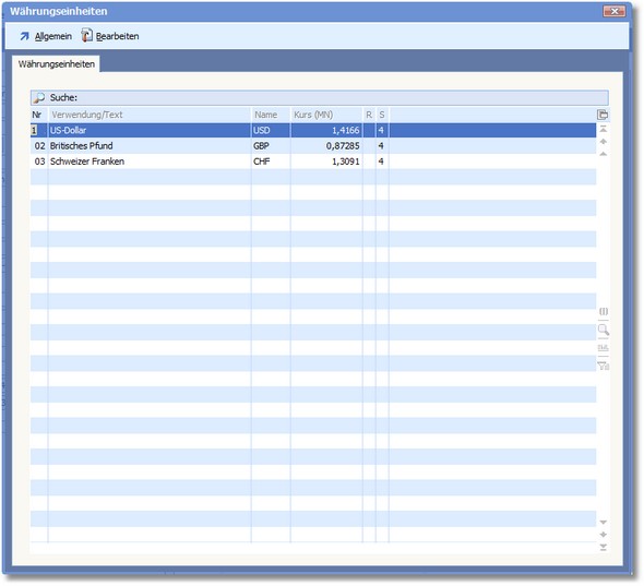 Bearbeiten Mit [RETURN] wird der Bearbeitungsdialog für die in der Tabelle markierte Währung geöffnet.
