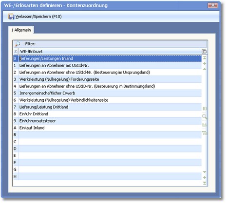 WE-/Erlösarten definieren steuerliche Geschäftsvorfälle, die einer Adresse zugeordnet und im Beleg - falls erforderlich - geändert werden können. Für jede WE-/Erlösart kann in der Kontenzuordnung ein Sachkonto und ein Steuerschlüssel eingetragen werden. Es können insgesamt 20 WE-/Erlösarten verwaltet werden.