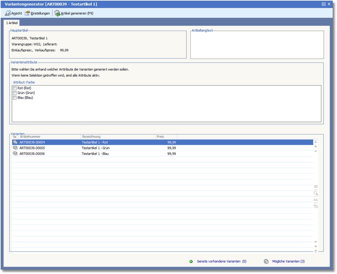 Sämtliche Varianten eines Artikels können mit dem Variantengenerator angelegt werden, vorausgesetzt, dass dem Hauptartikel Attribute und eine Attributgruppe zugewiesen wurde.