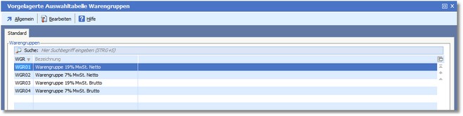 Die vorgelagerte Auswahltabelle der Warengruppen wird geöffnet.