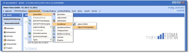 1. Klicken Sie mit der Maus im Hauptmenü auf "Warenwirtschaft > Stammdaten > Konditionen > Adress/Warengruppen".